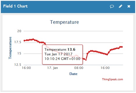 Thingspeak is an IOT service to which you can send information from an ESP-8266 for example and have it published on a website that is publically accessible. For me it is ideal for testing purposes. The service takes the data I send to it, and puts it on a chart. This makes it possible for me to examine information from my home systems even when I am at work or abroad.